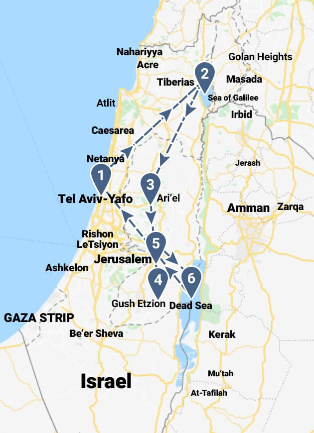 • Cities: Tel Aviv,  Caesarea, Haifa, Atlit, Sefat, Golan Heights, Tiberius, Samaria, Gush Etzion, Hebron, Jerusalem, Masada